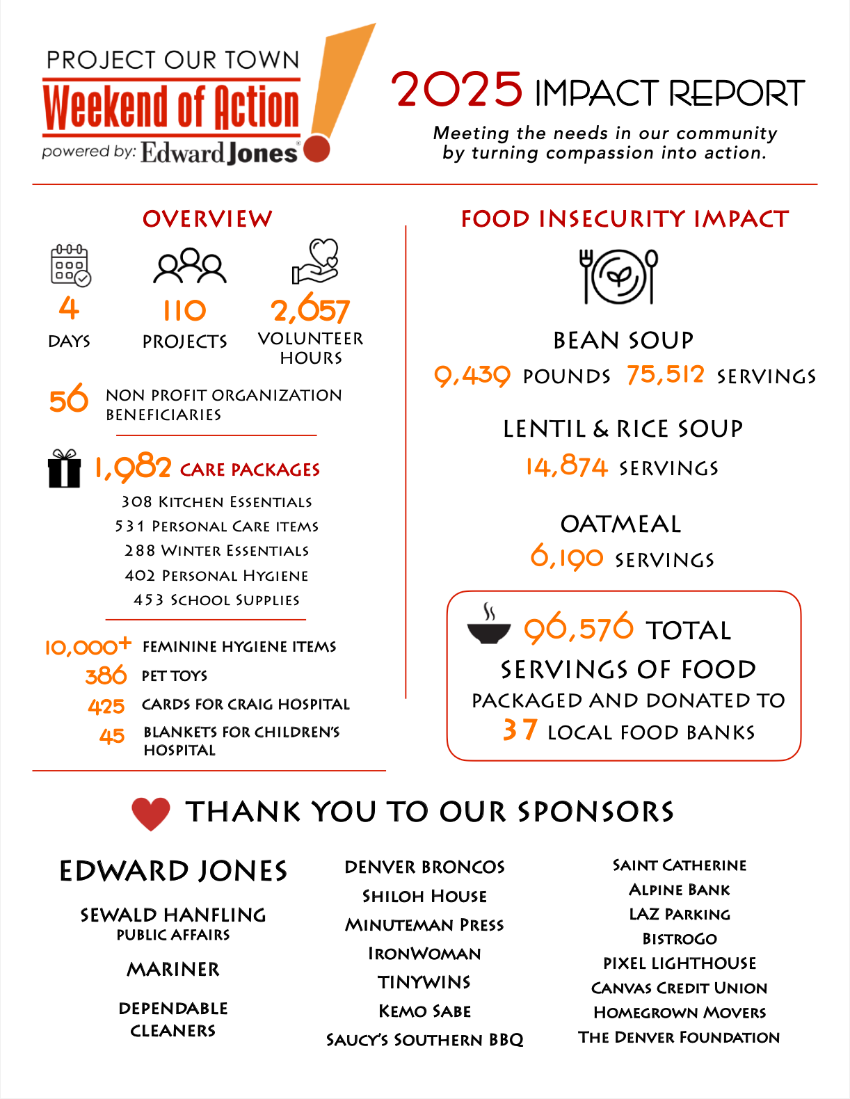 As a corporate sponsor for PROJECT OUR TOWN's Weekend of Action, you will not only showcase your company’s commitment to community impact, but also amplify the reach and effectiveness of this signature event. Together, we can create meaningful change, strengthen neighborhoods, and inspire others to take action. CLICK HERE for sponsorship information.